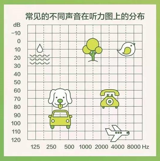 我們日常生活中常聽到的環境聲在聽力圖上都可以找到相對應的頻率和強度范圍,例如: