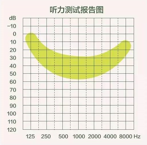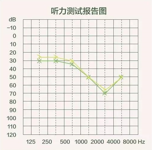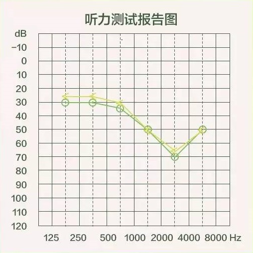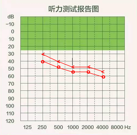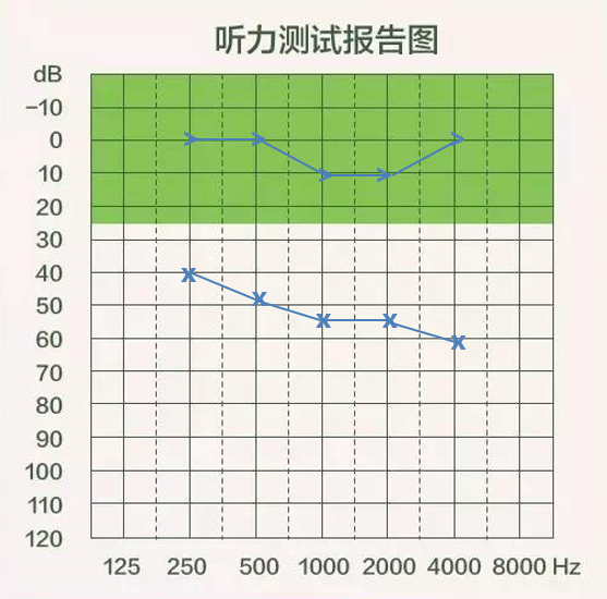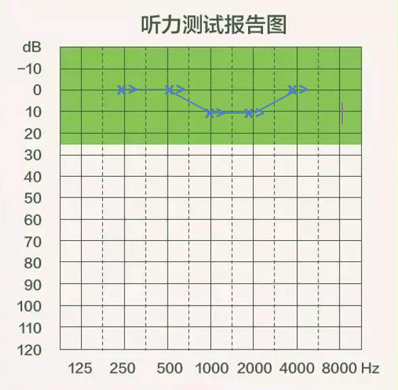 氣導線和骨導線都在圖中的綠色區域內,而且距離比較接近,這樣的聽力測試圖就是合格的,表示可以聽到和聽清生活中絕大多數的聲音。