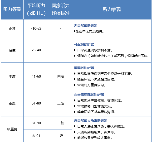 世界衛生組織(WHO1997)聽力障礙根據 500、1000、2000 及 4000Hz 氣導的平均聽閾進行分級。