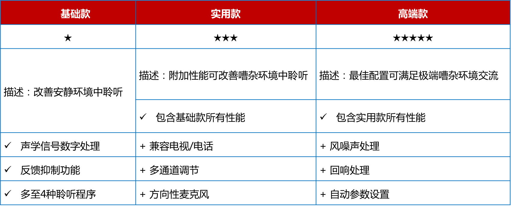 <span style="font-size:16px;"> 助聽器價格取決于機器的檔次,而檔次由內(nèi)含的技術(shù)種類決定。助聽器檔次大致可分為基礎(chǔ)款、實用款、高端款。這三種檔次的區(qū)別請參見下表:</span></p><p style="text-align: center;"><span style="font-size:16px;"><img src="/upfiles/201808150226553383.png" width="640" alt="" /><br /></span></p><p><span style="font-size:16px;"> 那么,如何應(yīng)該選擇哪種檔次的助聽器呢?</span></p><p><span style="font-size:16px;"> 選擇助聽器時主要需要考慮兩大因素。首先要考慮的就是弱聽人士的聽力損失程度,其次要考慮的就是弱聽人士的日常生活方式。比方說,某位弱聽人士是中度聽力損失,日常在家為主,那么實用款檔次助聽器通常可以滿足TA的需求。</span></p><p><span style="font-size:16px;"> 當然,這里只是為助聽器選配提供了大致方向,如何選配仍然需要具體情況具體分析,最好還是需要跟驗配師面對面溝通。</span></p><p><span style="font-size:16px;"> 1、高端款助聽器</span></p><p><span style="font-size:16px;"> 不同廠家的高端款助聽器均代表了各自的尖端技術(shù),并致力于提供最佳的音質(zhì)。</span></p><p><span style="font-size:16px;"> 這類助聽器高端之處在于自動適應(yīng)各種聆聽環(huán)境,最優(yōu)化佩戴者的聆聽清晰度和舒適度,讓佩戴者在極度嘈雜的環(huán)境中,如咖啡館,也能清晰地聽到同伴的言語聲。常見性能包括:</span></p><p><span style="font-size:16px;"> (1) 多種外觀、顏色可選;</span></p><p><span style="font-size:16px;"> (2) 環(huán)境自適應(yīng);</span></p><p><span style="font-size:16px;"> (3) 360°信號追蹤;</span></p><p><span style="font-size:16px;"> (4) 兼容各種藍牙設(shè)備。</span></p><p><span style="font-size:16px;"> 高端款助聽器為什么能夠自動適應(yīng)各種聆聽環(huán)境呢?這是因為左右兩側(cè)的高端款助聽器能夠相互“通電報”,精準判斷所處的聆聽環(huán)境并自主學習,給出最佳的助聽設(shè)置。</span></p><p><span style="font-size:16px;"> 比如,您經(jīng)常出入一家書店,每次您進入這家書店時總是習慣性地將音量調(diào)低2分貝;長此以往,當您再次進入該書店時,兩臺助聽器將會默契地降低2分貝。</span></p><p><span style="font-size:16px;"> 360°信號追蹤可以幫助佩戴者建立更佳的空間感知,對所處環(huán)境有充足的把控和預(yù)判,避免一些潛在的危險。而當助聽器連接至各種藍牙設(shè)備時,聆聽清晰度會更高,且不會打擾其他人。</span></p><p><span style="font-size:16px;"> 比如家人總是抱怨您把電視機聲音開得太大,拒絕跟您一起觀看電視時,您可以選配能夠兼容電視的助聽器,并進行獨立的音量調(diào)節(jié),而家人只需設(shè)置為常規(guī)音量即可。高端款助聽器的價位一般在15000以上。</span></p><p style="text-align: center;"><span style="font-size:16px;"><img src="/upfiles/201808150228328500.jpg" alt="" /><br /></span></p><p><span style="font-size:16px;"> 2、實用款助聽器</span></p><p><span style="font-size:16px;"> 實用款助聽器的價格一般在8000~15000之間。實用款助聽器包含一定的降噪技術(shù)和言語提升功能,可以滿足大多數(shù)環(huán)境中的聆聽需求。部分廠家的實用款助聽器也可兼容各種藍牙設(shè)備。實用款助聽器的突出性能大致包括:</span></p><p><span style="font-size:16px;"> (1) 可連接外接音源;</span></p><p><span style="font-size:16px;"> (2) 言語清晰度提升;</span></p><p><span style="font-size:16px;"> (3) 方向性功能。</span></p><p><span style="font-size:16px;"> 3、基礎(chǔ)款助聽器</span></p><p><span style="font-size:16px;"> 基礎(chǔ)款助聽器的價位一般在8000以下。基礎(chǔ)款助聽器能夠滿足安靜環(huán)境中的交流需求,并具備反饋管理功能。反饋管理功能能夠有效提升佩戴舒適度,避免在日常佩戴過程中出現(xiàn)尖銳的干擾聲。</span></p><p><span style="font-size:16px;"> 基礎(chǔ)款助聽器適用于經(jīng)常在家的弱聽人士,若是生活方式比較豐富多彩的弱聽人士建議選配其他檔次的助聽器。實用款助聽器的突出性能大致包括:</span></p><p><span style="font-size:16px;"> (1) 數(shù)字信號處理技術(shù);</span></p><p><span style="font-size:16px;"> (2) 反饋管理功能;</span></p><p><span style="font-size:16px;"> (3) 多種聆聽程序可選。</span></p><p><span style="font-size:16px;"> 更多詳情請登錄m.zhengzhoufuke.com。</span></p>" />