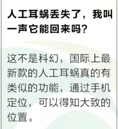 2019年4月10日這是一個(gè)新型的欄目<br /> 一本正經(jīng)地奇思妙想<br /> 內(nèi)容全靠一張圖<br /> 言語(yǔ)僅僅三兩句<br /> 大家隨便看看就行了<br /> 可一定得往心里去啊<br /><br /></span><div style="text-align: center;"><img src="/upfiles/20190410093258759.jpg" alt="" /></div> 嚴(yán)肅點(diǎn):幾乎每個(gè)月,都有人工耳蝸丟失的事件發(fā)生,每一次都會(huì)成為該地方新聞的焦點(diǎn)。<br /> 無(wú)論我們多么小心,不經(jīng)意間的疏忽總會(huì)造成大麻煩。對(duì)于遺失耳蝸的家庭來說,一方面要承擔(dān)一筆不少的購(gòu)機(jī)費(fèi)用,另一方面會(huì)有一段時(shí)間的“聽力真空期”,我們不禁感嘆,要是耳蝸能自己報(bào)告位置就好了。<br /> 實(shí)際上這并非空想,國(guó)際某品牌人工耳蝸的最新設(shè)備已經(jīng)可以實(shí)現(xiàn)遺失位置定位,通過手機(jī),我們可以找到處理器所在的大致位置(如果你有興趣,可以留言交流)。<br /> 5G時(shí)代,萬(wàn)物互聯(lián),遺失定位也是未來人工耳蝸產(chǎn)品設(shè)計(jì)的趨勢(shì)之一,未來小伙伴們就可以體驗(yàn)這種技術(shù)啦。<br /> 相關(guān)推薦閱讀:<a href="http://m.zhengzhoufuke.com/listDetail.aspx?id=102609" target="_blank"><strong><span style="color:#3333ff;">保如果世界上沒有聽力設(shè)備:助聽器和耳蝸。</span></strong></a><br /><br /><br /> 聽覺有道助聽器價(jià)格:http://m.zhengzhoufuke.com/products.html<br /><br /><br /> 發(fā)布于2019年4月10日 星期三<br /> 上午9:33分" />