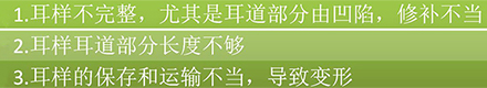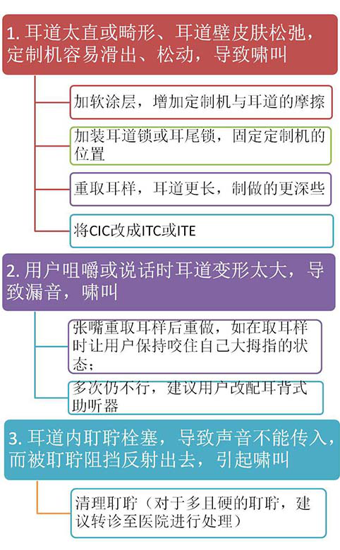 助聽器的嘯叫一直是困擾用戶和驗(yàn)配師的主要問(wèn)題之一,其中定制機(jī)的嘯叫問(wèn)題尤其突出。</p><p> 定制機(jī)是根據(jù)病人的聽力狀況和耳道形狀定制的,每一臺(tái)的制作都是獨(dú)一無(wú)二的,因此出現(xiàn)嘯叫的原因也比標(biāo)準(zhǔn)制作過(guò)程的耳背式助聽器復(fù)雜得多,有些定制機(jī)甚至多次重做仍然不能排除嘯叫。</p><p> 但無(wú)論如何只要我們客觀、理智地對(duì)待嘯叫問(wèn)題,找出癥結(jié)之所在,對(duì)癥下藥,那么減少甚至避免嘯叫的也并非難事。</p><p> 什么是嘯叫?</p><p> 所謂嘯叫就是助聽器發(fā)出刺耳的連續(xù)尖叫聲,術(shù)語(yǔ)上我們稱之為聲反饋,它可能是聲音反饋或電路上的正反饋。</p><p> </p><center><img alt="" src="/upfiles/201905070200484006.png" width="440" height="250" /></center><p></p><p> 內(nèi)部嘯叫和外部嘯叫</p><p> 嘯叫分內(nèi)部嘯叫和外部嘯叫兩種。外部嘯叫主要是定制機(jī)外殼或耳背機(jī)耳模與耳道不密封引起的,而其它原因引起的嘯叫可稱為內(nèi)部嘯叫。</p><p> </p><center><img alt="" src="/upfiles/201905070200528641.png" width="440" height="250" /></center><p></p><p> 區(qū)分內(nèi)部嘯叫和外部嘯叫</p><p> 區(qū)分內(nèi)部和外部嘯叫時(shí)必須用聽筒,驗(yàn)配師用聽筒連接到用戶反映有嘯叫的助聽器的出聲孔,可用橡皮泥密封接口和通氣孔,不使聲音泄漏出來(lái),然后從聽筒內(nèi)聽助聽器的輸出聲,若仍有嘯叫則說(shuō)明助聽器有內(nèi)部嘯叫,否則說(shuō)明助聽器只有外部嘯叫。</p><p> 內(nèi)部嘯叫的原因和排除</p><p> 內(nèi)部嘯叫的主要原因有:</p><p> </p><center><img alt="" src="/upfiles/20190507020058626.png" width="440" height="250" /></center><p></p><p> 為了防止助聽器出現(xiàn)內(nèi)部嘯叫,除了助聽器廠家對(duì)產(chǎn)品制作和檢驗(yàn)把好關(guān),對(duì)于驗(yàn)配師和用戶來(lái)說(shuō),需要特別注意兩點(diǎn):</p><p> </p><center><img alt="" src="/upfiles/201905070201041323.png" width="440" height="100" /></center><p></p><p> 外部嘯叫的原因和排除</p><p> 絕大部分用戶抱怨的定制機(jī)嘯叫是指外部嘯叫,外部嘯叫的原因和處理方法非常復(fù)雜,從定制機(jī)的整個(gè)驗(yàn)配過(guò)程來(lái)看,我們可以將這些根原歸納到下面四大類:</p><p> 1.耳道</p><p> 耳道的客觀情況是產(chǎn)生嘯叫的主要原因,其可能引起嘯叫的原因及解決方法如下:</p><p> </p><center><img alt="" src="/upfiles/201905070201091323.png" width="482" height="780" /></center><p></p><p> 2.耳樣(印模)</p><p> 耳樣是定制機(jī)外殼制作的原型,耳樣的好壞直接影響到外殼完成后的密封性和舒適度,病人的聽力損失越重,對(duì)耳樣的要求也越高。在耳樣這一環(huán)節(jié)的如下情況將導(dǎo)致定制機(jī)嘯叫:</p><p> </p><center><img alt="" src="/upfiles/201905070201157387.png" width="440" height="80" /></center><p></p><p> 取耳樣是驗(yàn)配師的基本功,必須在充分檢查耳道基礎(chǔ)上,膽大心細(xì)地取到合格的耳樣。</p><p> 3.選配和調(diào)試</p><p> </p><center><img alt="" src="/upfiles/201905070201216863.png" width="440" height="250" /></center><p></p><p> 選配最重要的就是做好外形和功率的平衡,不要為拉定單而勉強(qiáng)選配,如果用戶需要加大音量至幾乎滿檔才能使用,就容易出現(xiàn)嘯叫。</p><p> 助聽器增益設(shè)置(通過(guò)音量電位器或驗(yàn)配軟件設(shè)置)的理想位置應(yīng)該是在滿檔增益的二分之一到三分之二之間。</p><p> </p><center><img alt="" src="/upfiles/201905070201277561.png" width="440" height="250" /></center><p></p><p> 任何機(jī)型都有其選配范圍,如果超出此選配范圍,要讓助聽器始終在滿負(fù)荷下工作,即使沒(méi)有嘯叫,助聽器的失真、噪音等也會(huì)增加很多。</p><p> 因此選配合適的機(jī)型、線路和矩陣比重做外殼更合理、有效。</p><p> </p><center><img alt="" src="/upfiles/201905070201336863.png" width="440" height="250" /></center><p></p><p> 需要特別注意的是:價(jià)格單上的參考驗(yàn)配范圍是指中高頻的值,但低頻一般會(huì)低20dB 左右,所以僅僅平均增益小于參考驗(yàn)配范圍并不能保證每個(gè)頻率點(diǎn)都在驗(yàn)配范圍內(nèi)。</p><p> 加通氣孔是讓病人配戴更舒適的方法之一,但有時(shí)它也是產(chǎn)生嘯叫的禍?zhǔn)祝藭r(shí)減小甚至于堵塞通氣孔往往能立竿見影。堵塞氣孔可以用棉花或印模膏。</p><p> 對(duì)于一些中高檔機(jī)型帶反饋抑制功能的線路,可以設(shè)置反饋抑制的力度更大,一些輕微的嘯叫就能立刻消除。</p><p> </p><center><img alt="" src="/upfiles/201905070201384912.png" width="440" height="120" /></center><p></p><p> 4.制作</p><p> 關(guān)于定制機(jī)制作中避免外部嘯叫主要是助聽器廠家工程師需要嚴(yán)格把關(guān),如果僅僅是定制機(jī)和耳道有輕微的不密封,可以加涂光亮漆或軟涂層處理,現(xiàn)場(chǎng)的維修中心技術(shù)員可以提供這一快速服務(wù)。</p><p> 需要重做時(shí),必須由經(jīng)驗(yàn)豐富的制作人員綜合驗(yàn)配師提供的信息和上次制作的記錄作出針對(duì)性措施。例如增加膨脹系數(shù)、加厚密封圈、加深耳道、調(diào)整出聲孔方向等。</p><p> 總之,定制機(jī)產(chǎn)生嘯叫的原因是多種多樣的,從取耳樣、選線路與矩陣直至制作,最后到調(diào)試和配戴,每一個(gè)環(huán)節(jié)處理不好都有可能產(chǎn)生嘯叫,只有抓
