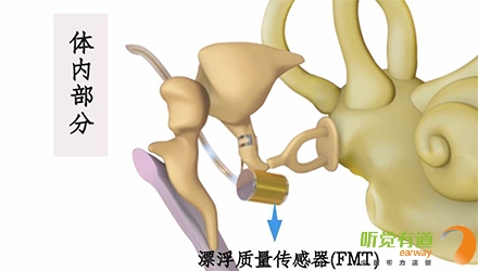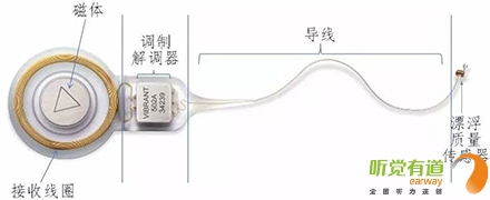 體內植入部分包括電磁感應接收線圈、內部磁體、調制解調器、導線和核心部分漂浮質量傳感器(FMT)。