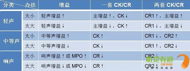 顧名思義,壓縮就是把超過一定強度的聲音減小至聽損患者縮小的殘余聽覺動態范圍里。相較于線性放大,壓縮可以有效達到“小聲聽得見,大聲受得了”的要求,尤其適用于感音神經性患者。</p><p> 壓縮參數主要有三個:壓縮拐點/壓縮閾值(CK/CT)、壓縮比(CR)與壓縮時間(起效時間AT,釋放時間RT)。下圖:橫坐標代表輸入級,即未經助聽器放大的聲音;縱坐標代表輸出級,即放大后的聲音。輸入與輸出的關系:輸出級=輸入級+增益,亦可表示:放大后的聲音=放大前的聲音+放大量。有了這個基礎,我們就可以清楚地理解這兩個參數的含義并進行調節。</p><p> 1、壓縮拐點(CK):線性放大與壓縮放大的臨界輸入級,此處為60 dB SPL,即輸入聲強度在60 dB SPL以下時為線性放大,超過60 dB SPL為壓縮放大。①紅線的輸入級范圍為0~60 dB,這段的聲音為線性放大,隨意找一個輸入級,用它對應的輸出級減去輸入級,得出線性放大的增益為30 dB;②當輸入級大于60 dB時,綠色曲線為壓縮放大,輸出與對應輸入的差值不再是30 dB,而是隨著輸入級增加,增益逐漸減小;③當輸出達到最大輸出限制時,輸出不再增大,保持在最大輸出限制位置。</p><p> </p><center><img alt="" src="/upfiles/201906120320158907.png" width="440" height="250" /></center><p></p><p> 2、壓縮比(CR):輸入級差值與輸出級差值的比值。上圖中線性狀態時壓縮比為1:1,可以找兩對數值,(輸入60-輸入0)/(輸出90-輸出30)=60/60=1:1。壓縮狀態時壓縮比為2:1,同樣可以找兩對數值,(輸入120-輸入60)/(輸出120-輸出90)=60/30=2:1。</p><p> 3、壓縮方式(CM):由于起效時間(AT)與釋放時間(RT)的不同組合構成不同的壓縮方式。</p><p> 助聽器由線性變換到壓縮時所需的穩定時間為起效時間。起效時間短,說明對大聲壓縮及時,不會造成聽力傷害;起效時間長,說明對大聲壓縮緩慢,有可能短暫感覺刺耳,但可以最大程度還原小聲與大聲的強度差異感。</p><p> 助聽器由壓縮回到線性時所需的穩定時間為釋放時間。釋放時間短,說明對小聲及時線性放大,避免小聲聽不見;釋放時間長,說明對小聲還在壓縮,放大不及時,有可能小聲聽不見,但可以最大程度還原大聲和小聲的強度差異感。</p><p> 我們可以做個比喻來了解壓縮的概念。假使你在高速路上,突然前方出現一個大大的警示牌,提示有事故發生,這時你需要迅速踩剎車以防撞擊。越早踩剎車相當于越早壓縮(壓縮拐點越小),剎車的力度越大相當于壓縮比越大,開始剎車至時速降至安全時速所需時間相當于起效時間,過了事故點踩油門,車速恢復至高速所需時間相當于釋放時間。</p><p> 壓縮是為了保護人們聽覺系統免受瞬間或持續中、大強度聲音的刺激,同時又能有效放大各種小聲的基本技術手段,可以使小聲、中等聲和大聲無一遺漏地進入聽障患者縮小的聽覺動態范圍中。</p><p> 恰當的壓縮拐點與壓縮比滿足了聽障患者達到“小聲聽得見、大聲受得了”的要求,而壓縮的起效時間與釋放時間設定需要考慮聽障患者個性化的聆聽喜好。</p><p> 起效時間與釋放時間都短,優點是小聲放大及時、大聲壓縮及時,即小聲聽得到大聲不覺吵,缺點是大小聲強度差異感不大;起效時間短釋放時間長,優點是大小聲強度差異感真實,音節間噪聲小,缺點是有可能小聲放大不足。</p><p> 事實上,各企業的助聽器軟件往往可以直接調節輕聲增益、中等聲增益、大聲增益與主增益而間接控制壓縮參數,有的軟件可見一套CK/CR,有的軟件可見兩套CK/CR。有些軟件會自動默認為自適應壓縮方式,能夠根據聲音強度差異自動調整。</p><p> 下圖匯總了對不同強度聲音不適的解決辦法,供大家參考。</p><p> </p><p><center><img alt="" src="/upfiles/201906120320202761.png" width="640" height="240" /></center><center><p style="text-align: left;"> 更多詳情請登錄聽覺有道助聽器m.zhengzhoufuke.com</p><br /></center></p>" />