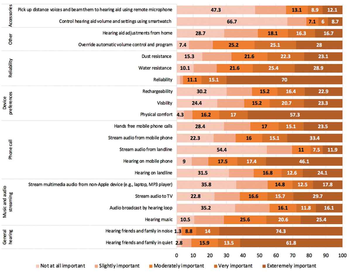 <span style="white-space:pre"> </span>助聽器用戶最關(guān)注的助聽器問題是什么呢?<br /><br /></span><p><span style="font-size:16px;"> 近兩年來,美國HearingTracker網(wǎng)站征集了上萬名助聽器使用者的意見,得到較為客觀的反饋數(shù)據(jù)。</span></p><p><span style="font-size:16px;"><br /></span></p><p style="text-align: center;"><span style="font-size:16px;"><img src="/upfiles/202109180411392952.jpg" width="640" alt="" /><br /></span></p><p style="text-align: center;"><span style="font-size:16px;"><br /></span></p><span style="font-size:16px;"> <strong>助聽器用戶最在意的:</strong><br /><br /> 噪聲環(huán)境下的清晰度<br /><br /> 設(shè)備可靠性<br /><br /> 安靜環(huán)境下的清晰度<br /><br /> 佩戴舒適度<br /><br /> <strong>助聽器用戶最不在意的:</strong><br /><br /> 智能手表控制<br /><br /> 固定電話流<br /><br /> 接收遠(yuǎn)處聲音的拓展性<br /></span><p><span style="font-size:16px;"> 聽覺環(huán)路</span></p><p><span style="font-size:16px;"><br /></span></p><p style="text-align: center;"><span style="font-size:16px;"><img src="/upfiles/202109180412136016.jpg" width="640" alt="" /><br /></span></p><div style="text-align: center;"><span style="font-size:16px;"> Data from HearingTracker's consumer survey,as analyzed by Vinaya Manchaiah and Erin Picou.</span></div><div style="text-align: center;"><span style="font-size:16px;"><br /></span></div><span style="font-size:16px;"><br /> 這個(gè)調(diào)查結(jié)果,也許并不出人意料。<br /><br /> 助聽器用戶們最關(guān)注的是在噪聲環(huán)境下的清晰度,其次是設(shè)備可靠性、安靜環(huán)境下的清晰度和佩戴舒適度。<br /><br /> 盡管近15%的人認(rèn)為通過智能手表來控制助聽器音量的功能是非常/極為重要的,但66.7%的人覺得沒什么必要。<br /><br /></span><p><span style="font-size:16px;"> 51.3%的用戶希望能夠在家調(diào)試自己的助聽器,而不必耗費(fèi)時(shí)間和精力到線下的醫(yī)院或驗(yàn)配中心。</span></p><p><span style="font-size:16px;"><br /></span></p><p style="text-align: center;"><span style="font-size:16px;"><img src="/upfiles/202109180412599513.jpg" width="640" alt="" /><br /></span></p><p style="text-align: center;"><span style="font-size:16px;"><br /></span></p><span style="font-size:16px;"> 超過90%的助聽器用戶認(rèn)為,戴上助聽器,無論是在噪聲環(huán)境還是安靜環(huán)境下,是否能聽清親友的聲音,都非常重要,尤其在噪聲環(huán)境。<br /><br /> 對于近幾年來火熱的無線連接功能,調(diào)查發(fā)現(xiàn):當(dāng)用戶熟悉使用這個(gè)功能后,會成為它的忠實(shí)粉絲。<br /><br /> 大多數(shù)用戶希望助聽器能夠支持手機(jī)通話,對支持使用固定電話的需求較少。<br /><br /> 70%以上的用戶希望助聽器能夠支持聽音樂,約62%的用戶希望通過音頻直傳連接電視。<br /><br /></span><p><span style="font-size:16px;"> 67%的用戶認(rèn)為助聽器的防塵性是重要的,75.9%的用戶認(rèn)為助聽器的防水性是重要的。</span></p><p><span style="font-size:16px;"><br /></span></p><p style="text-align: center;"><span style="font-size:16px;"><img src="/upfiles/202109180413225493.jpg" width="640" alt="" /><br /></span></p><p style="text-align: center;"><span style="font-size:16px;"><br /></span></p><span style="font-size:16px;"> 助聽器的可靠性(安全耐用)始終是用戶關(guān)心的重要話題,關(guān)注程度遠(yuǎn)超隱蔽性、可充電性。<br /><br /> 當(dāng)今世界助聽器技術(shù)發(fā)展,勢必要為所有的助聽器用戶著想,所以更側(cè)重于上面用戶關(guān)注度排在前列的技術(shù)發(fā)展鉆研。但這對小部分人來說,并不是一件很酷的事。<br /><br /> 參考:HearingTracker網(wǎng)站,聽力行業(yè)通訊<br /><br /> 調(diào)查結(jié)果可能會受地域與文化影響而有所差異,但有一定的參考價(jià)值</span>" />