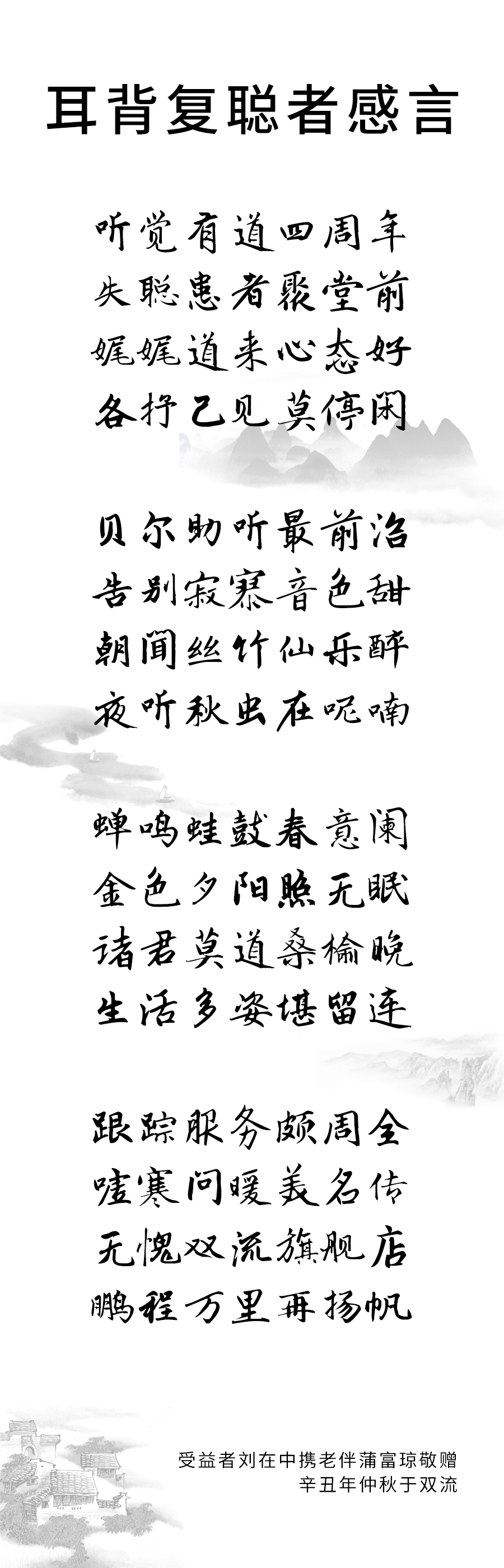 對聽覺有道雙流旗艦店,劉老更是不吝贊詞:“跟蹤服務頗周全,噓寒問暖美名傳。無愧雙流旗艦店,鵬程萬里再揚帆。”